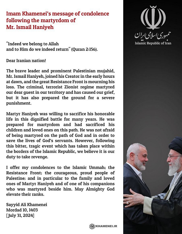 Leader vows to avenge blood of dear guest Haniyeh warns Israel of ‘harsh punishment’