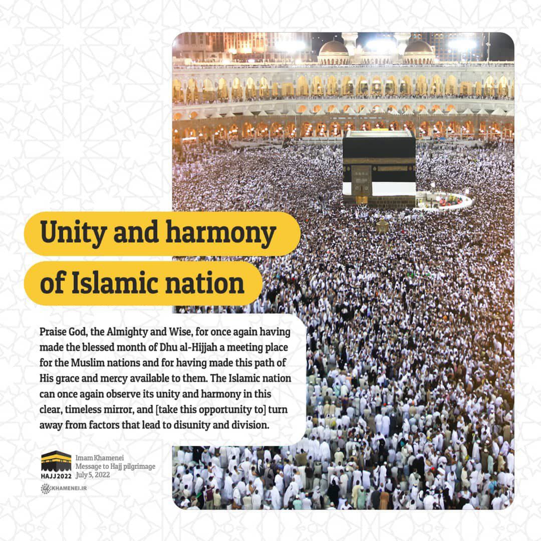 Persatuan umat Islam adalah salah satu dari dua landasan mendasar haji, yang jika dikombinasikan dengan zikir dan spiritualitas, yang merupakan fondasi dasar lain dari kewajiban yang penuh dengan misteri ini, dapat membawa umat Islam ke puncak kehormatan dan kebahagiaan, dan menjadikannya sebagai contoh dari: