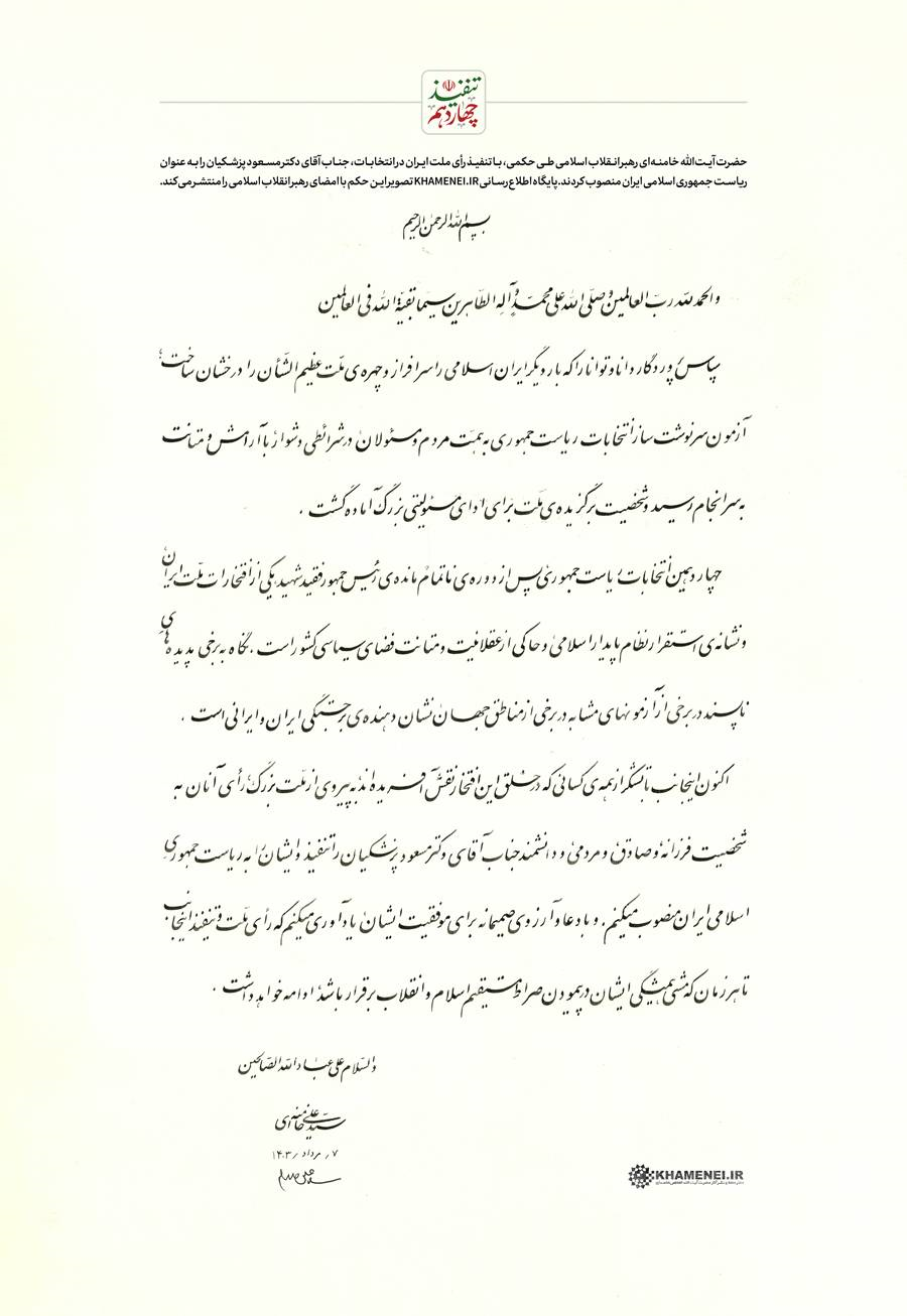 Tehran, Parstoday mengutip informasi dari Kantor Pemimpin Besar Revolusi Islam Iran bahwa Rahbar mengumumkan teks pengukuhan jabatan presiden untuk Dr. Masoud Pezeshkian dsebagai berikut: